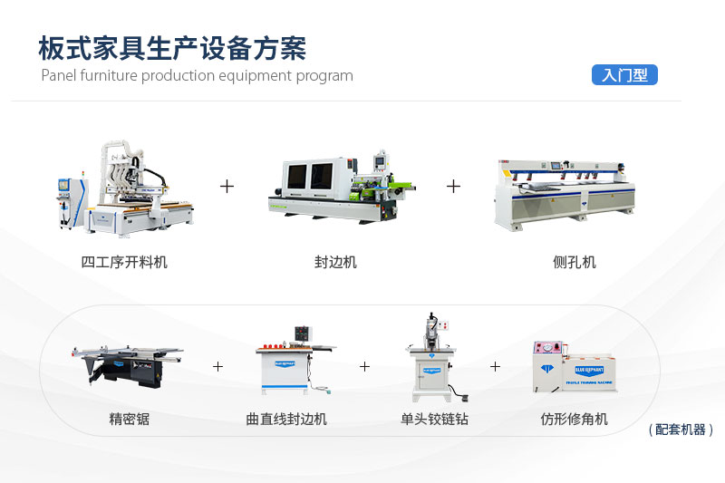 ?入門(mén)型-板式家具生產(chǎn)設(shè)備方案柜體生產(chǎn)解決方案主要由四工序開(kāi)料機(jī)、封邊機(jī),鋸片側(cè)孔機(jī)、精密鋸、曲直線封邊機(jī)、單頭鉸鏈鉆孔機(jī)、倒角機(jī)七種設(shè)備組成,可用于加工生產(chǎn)板式家具、櫥柜、衣柜、板式家具、兒童家具等柜體的制造加工。